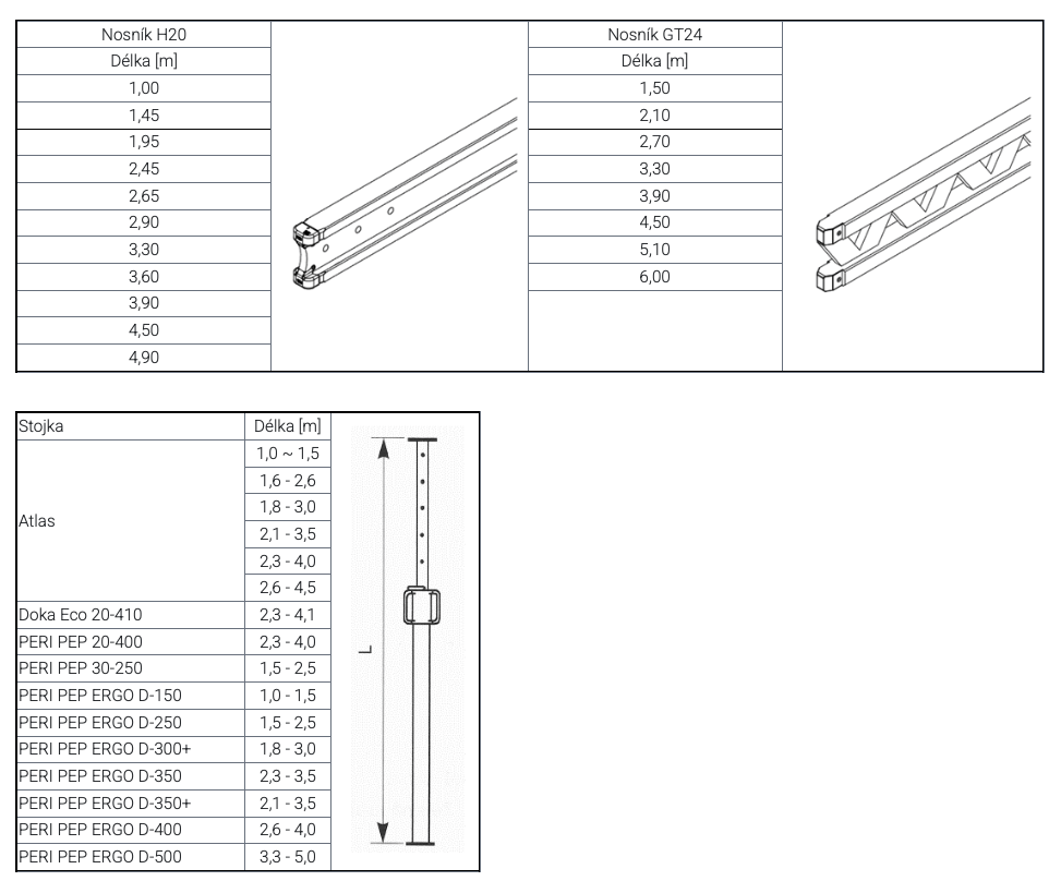 Přesné přizpůsobení každé délce umožňuje překrývání nosníků. Jemným nastavením stojek lze dosáhnout požadované výšky a to od 1,45 m do 5 m.